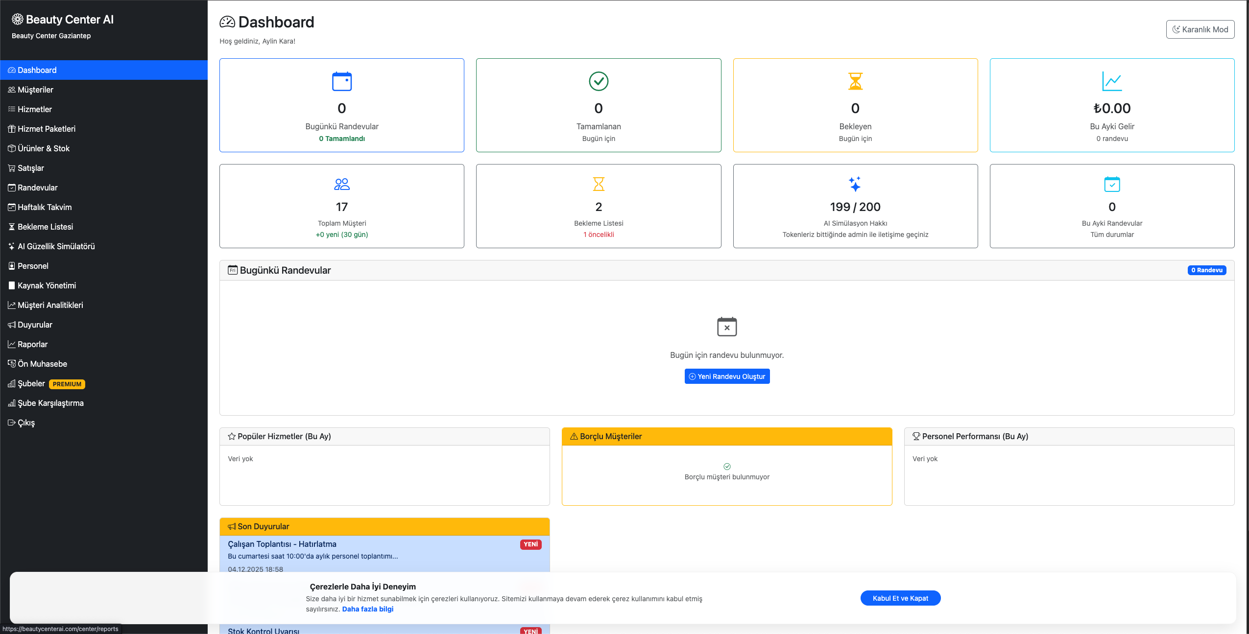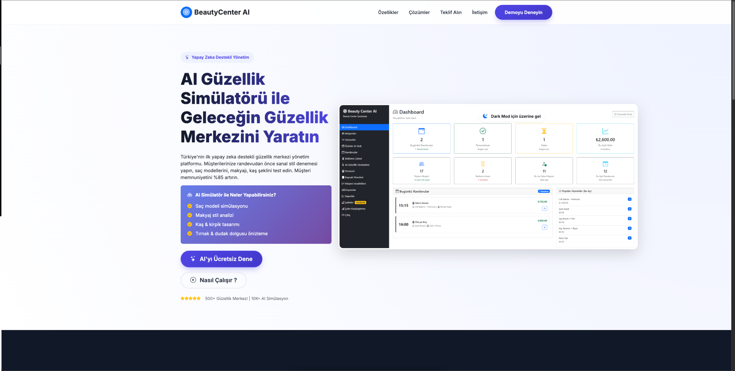 BeautyCenter AI projesinde hedef, güzellik merkezleri için yapay zeka destekli yönetim yazılımı ve simülasyon deneyimini tek bir platformda birleştirmekti. Mevcut sistemlerde kullanıcı deneyimi zayıf, mobil uyumluluk yetersiz ve güzellik merkezi yönetim süreçleri dağınık bir yapıdaydı. Ayrıca kullanıcıların saç modeli, makyaj ve yüz analizi gibi işlemleri önceden deneyimleyebileceği bir AI simülasyon sistemi bulunmuyordu. Bu nedenle modern, hızlı ve SEO uyumlu bir dijital platform ihtiyacı ortaya çıktı.**BeautyCenter AI projesinde hedef, güzellik merkezleri için yapay zeka destekli yönetim yazılımı ve simülasyon deneyimini tek bir platformda birleştirmekti. Mevcut sistemlerde kullanıcı deneyimi zayıf, mobil uyumluluk yetersiz ve güzellik merkezi yönetim süreçleri dağınık bir yapıdaydı. Ayrıca kullanıcıların saç modeli, makyaj ve yüz analizi gibi işlemleri önceden deneyimleyebileceği bir AI simülasyon sistemi bulunmuyordu. Bu nedenle modern, hızlı ve SEO uyumlu bir dijital platform ihtiyacı ortaya çıktı.