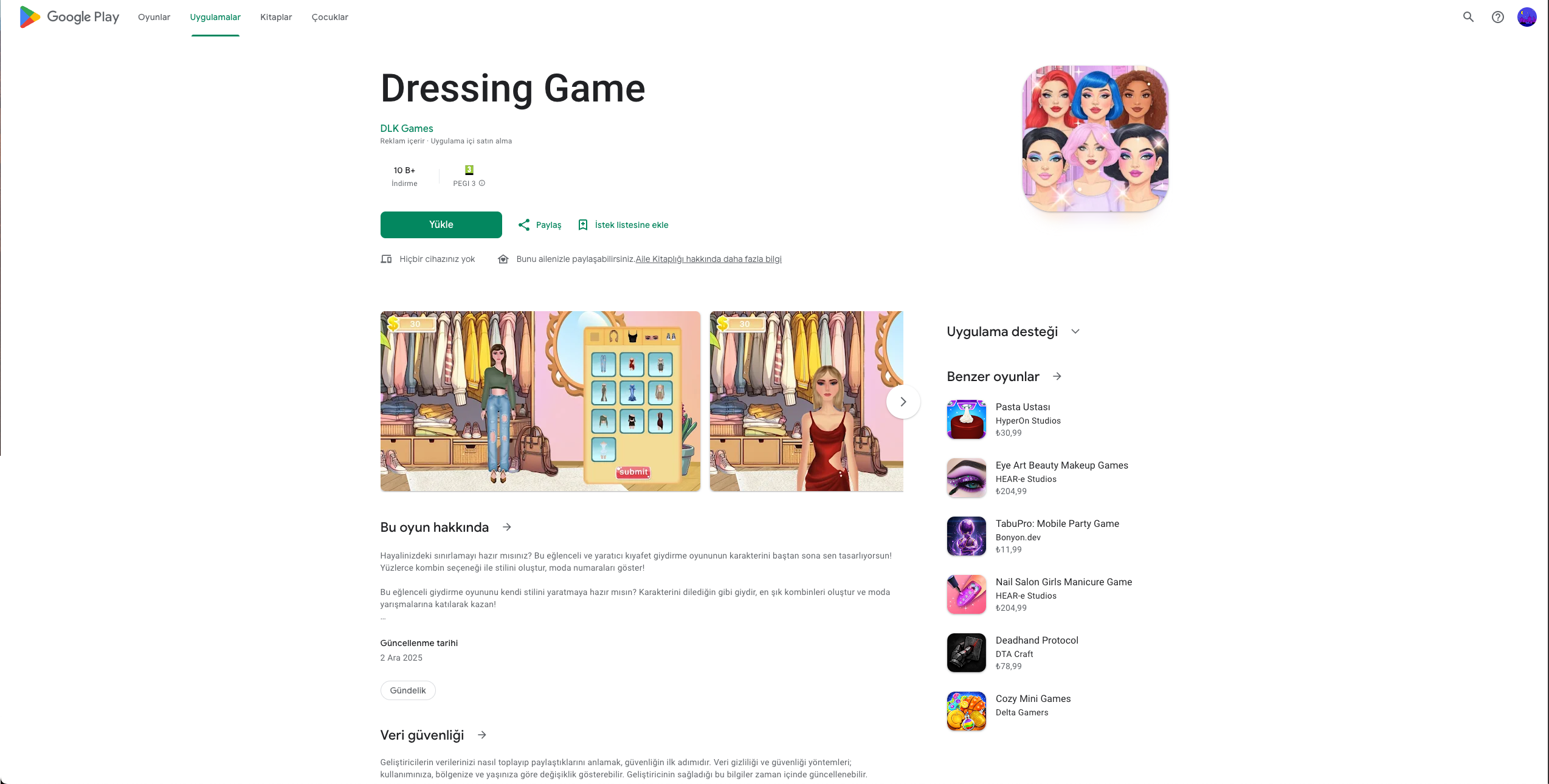 Dressing Game, moda ve stil oyunlarını seven kullanıcılar için geliştirilmiş eğlenceli bir mobil giydirme oyunudur. Oyuncular farklı kıyafetler ve aksesuarlar ile karakterlerini tasarlayabilir, kendi moda tarzlarını oluşturabilir. Android ve iOS platformlarında oynanabilen bu kız giydirme oyunu, renkli tasarımı ve kolay oynanışı ile dikkat çekmektedir.