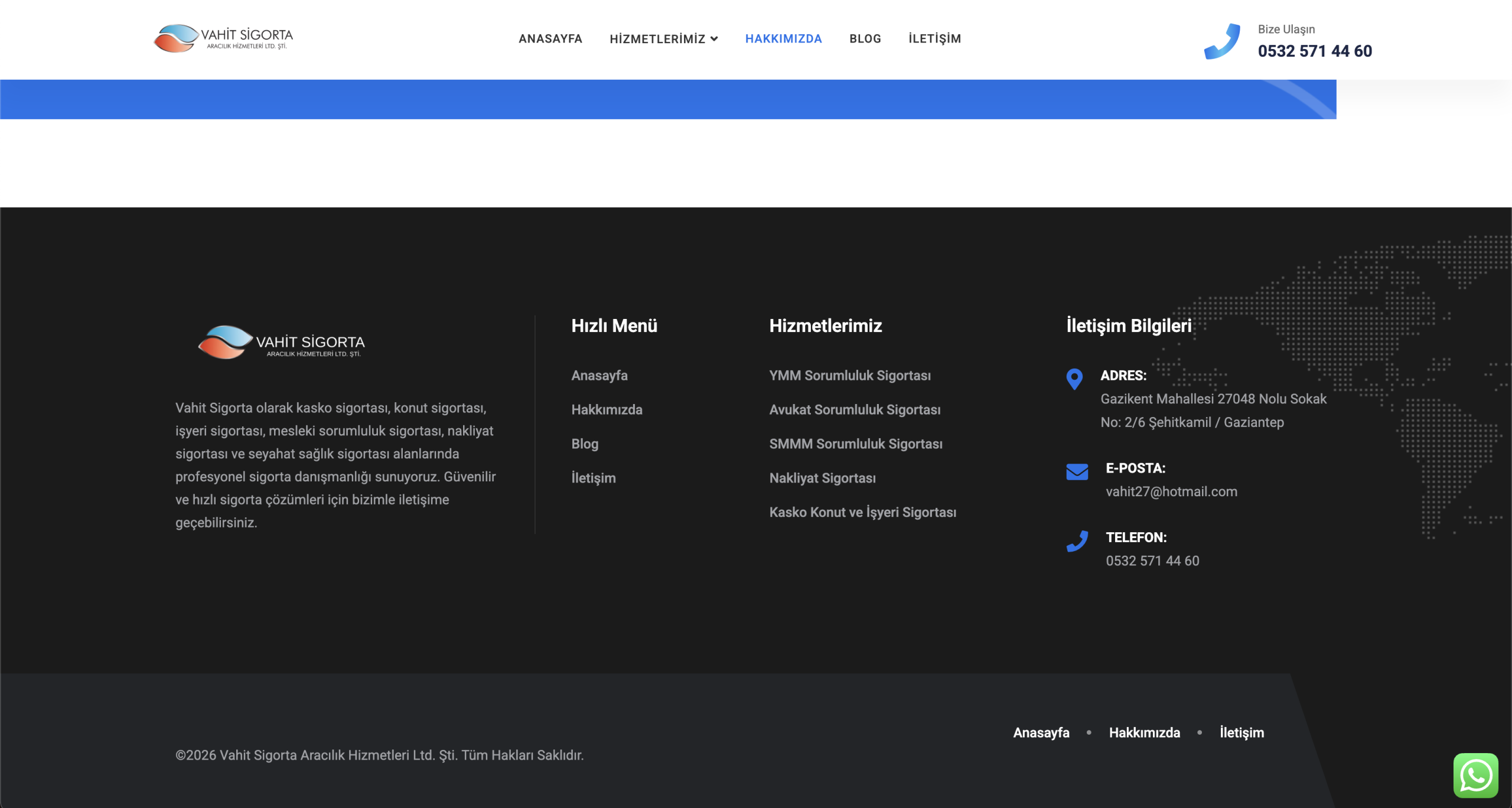 Vahit Sigorta için modern ve kullanıcı odaklı bir kurumsal sigorta web sitesi geliştirdik. Proje kapsamında sigorta hizmetlerinin dijital ortamda kolayca sunulabileceği, hızlı ve güvenilir bir SEO uyumlu web sitesi tasarlandı.